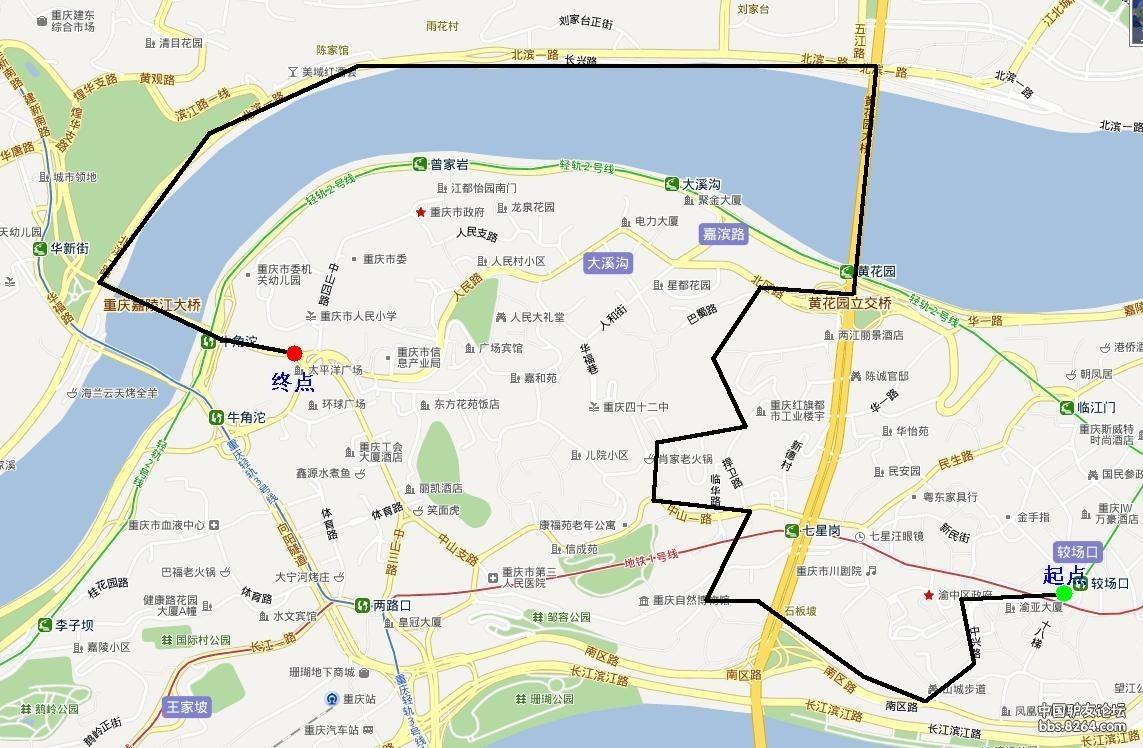 较场口---中兴路---山城步道---石坂坡步道---地铁七星岗站2号出口---观音岩---张家花园步道---黄花园大桥---北滨路---嘉陵江大桥下结束,全程9KM。